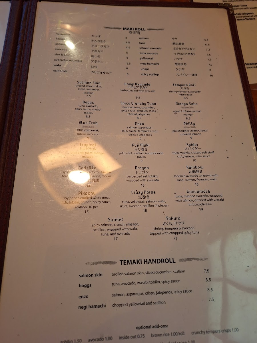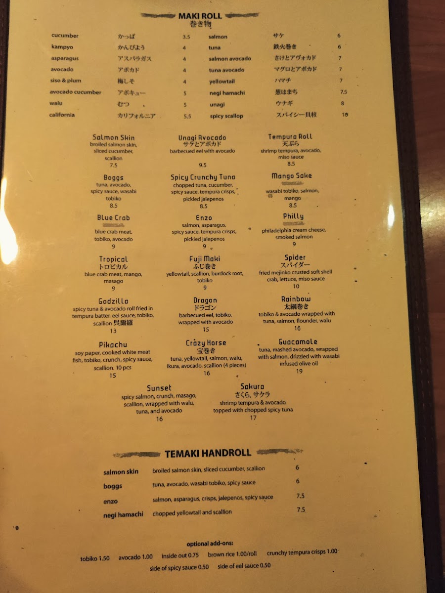 Finally, Fuji’s Maki selections, including classic rolls like Cucumber, Avocado, and more creative options like the Salmon Skin and Spicy Crunchy Tuna, ensure that sushi lovers can find something to satisfy their cravings. The Specialty Maki, like Mango Sake and Boggs, further elevate the menu with exciting and innovative rolls. For a more interactive experience, the Temaki options, including Spicy Hotate and Negi Hamachi, are perfect for those looking for a hand-rolled treat.