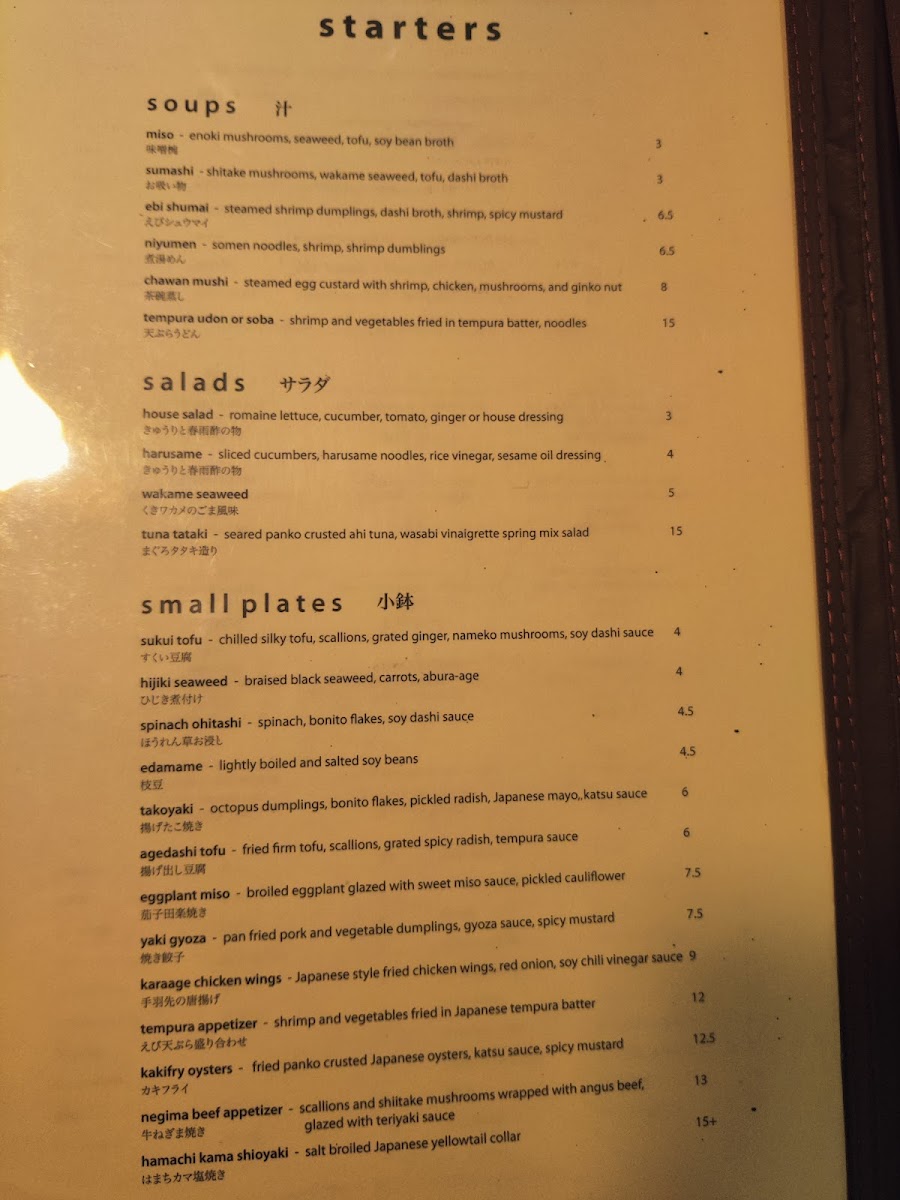 To start, the soups are a comforting beginning to any meal, with options like Miso and Sumashi soups, as well as the more unique NiyumenEbi Shumai and Chawan Mushi. For a refreshing touch, their salads stand out with choices like House Salad, Harusame, and the seaweed-based Wakame. If you're craving something with a little more substance, the Tuna Tataki and Harusame Cucumber Salad are also great picks.